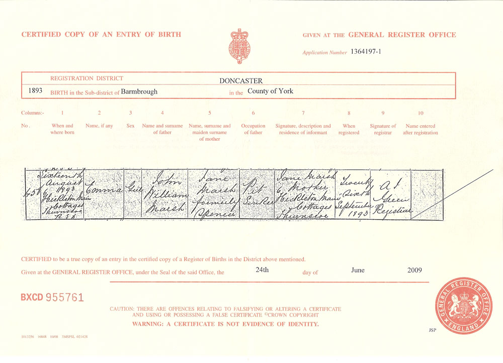 The birth certificate shows that Emma was born on 16th August 1893 to John William Marsh and Jane Marsh (formerly Spencer). John William Marsh was a Pit Sinker and the family was living at Hickleton Main Cottages, Thurnscoe.