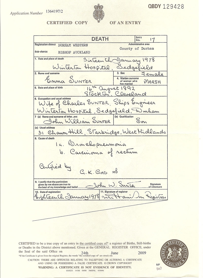 Her death was recorded as taking place at Winterton Hospital, Sedgefield, Durham on 16th January 1978. Loft is given as the informant.