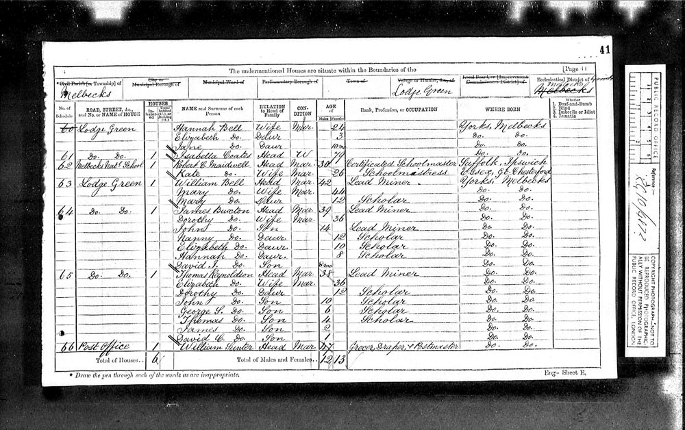 Isabella Sunter, 20, lodger, married, lead miner’s wife, Yorkshire Grinton, abt 1851
