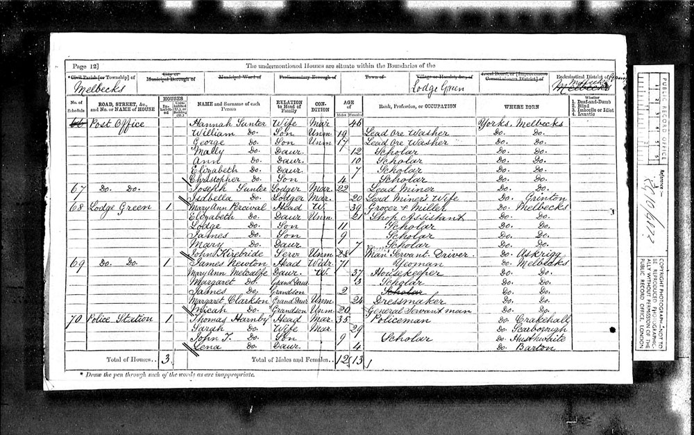 Clearly the same family as in 1861. What has happened now is that Joseph has gone and got himself married to Isabella. Isabella and Joseph are now lodging together with the rest of the Sunter family: