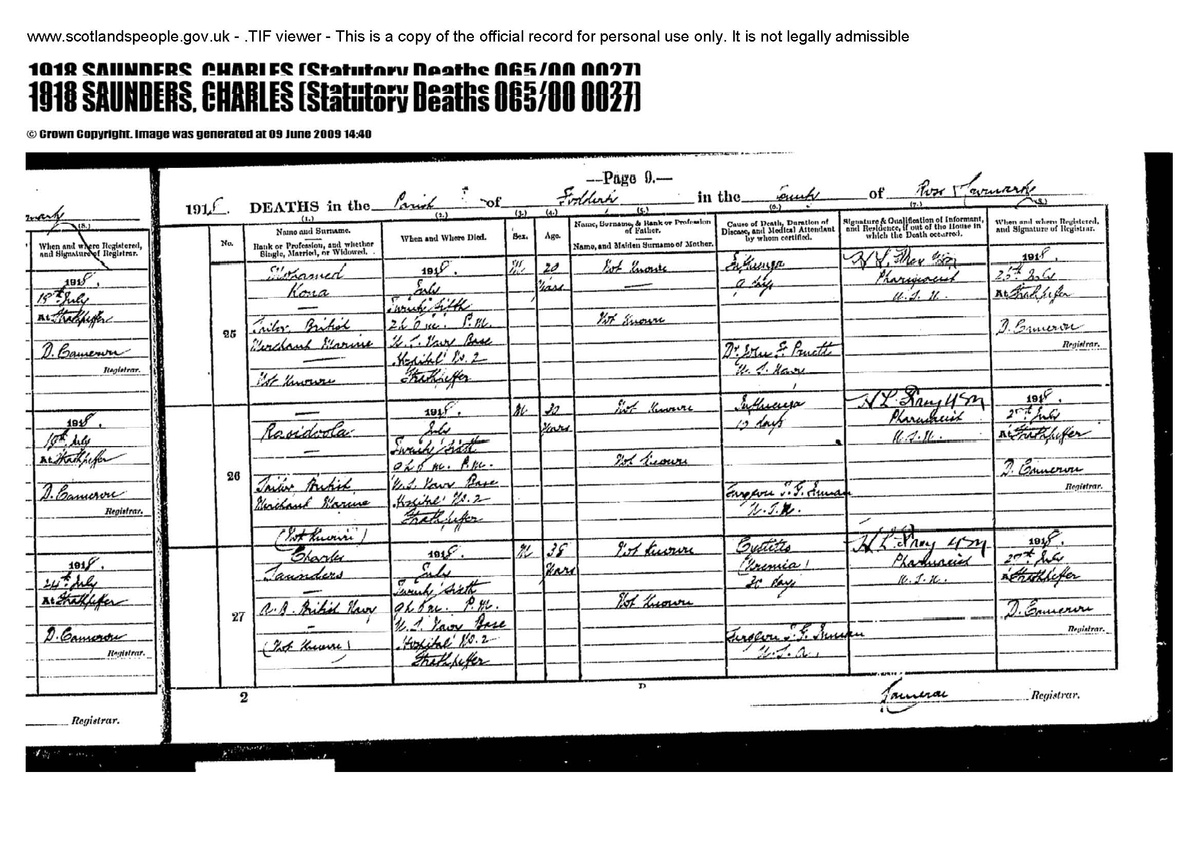 Charles Saunders, A.B British Navy, Unknown whether married, Died 26th July 1918 at 9.06pm. Parents not known – place of death the navel base hospital.